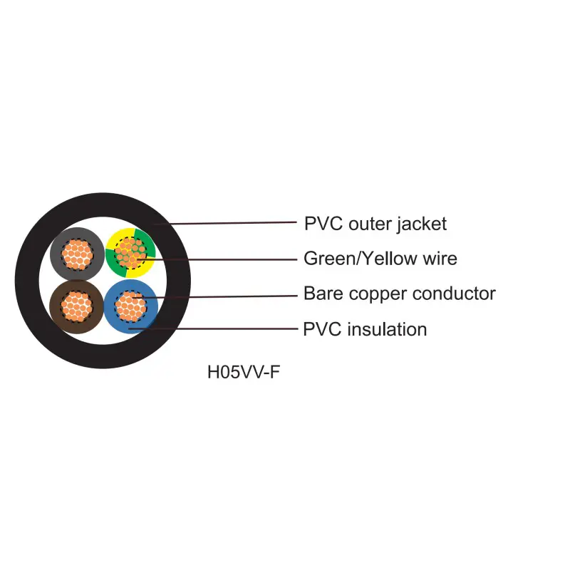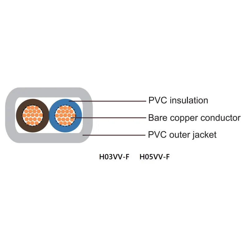 H05VV-F, H05VVH2-F, H03VV-F, H03VVH2-F bao gồm dây dẫn đồng loại 5, lớp cách điện và vỏ bọc PVC không chì.