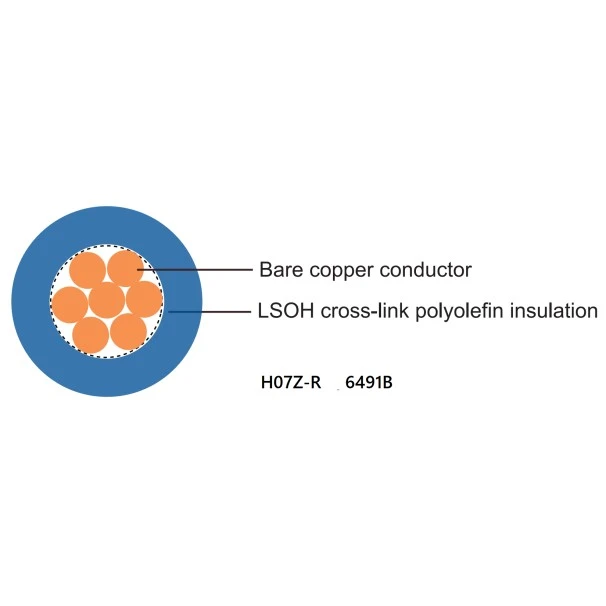 Cáp lõi đơn cách điện LSZH bao gồm một dây dẫn đồng T1R và lớp cách điện polyolefin liên kết ngang LSOH (còn gọi là vật liệu cách nhiệt LSOH).